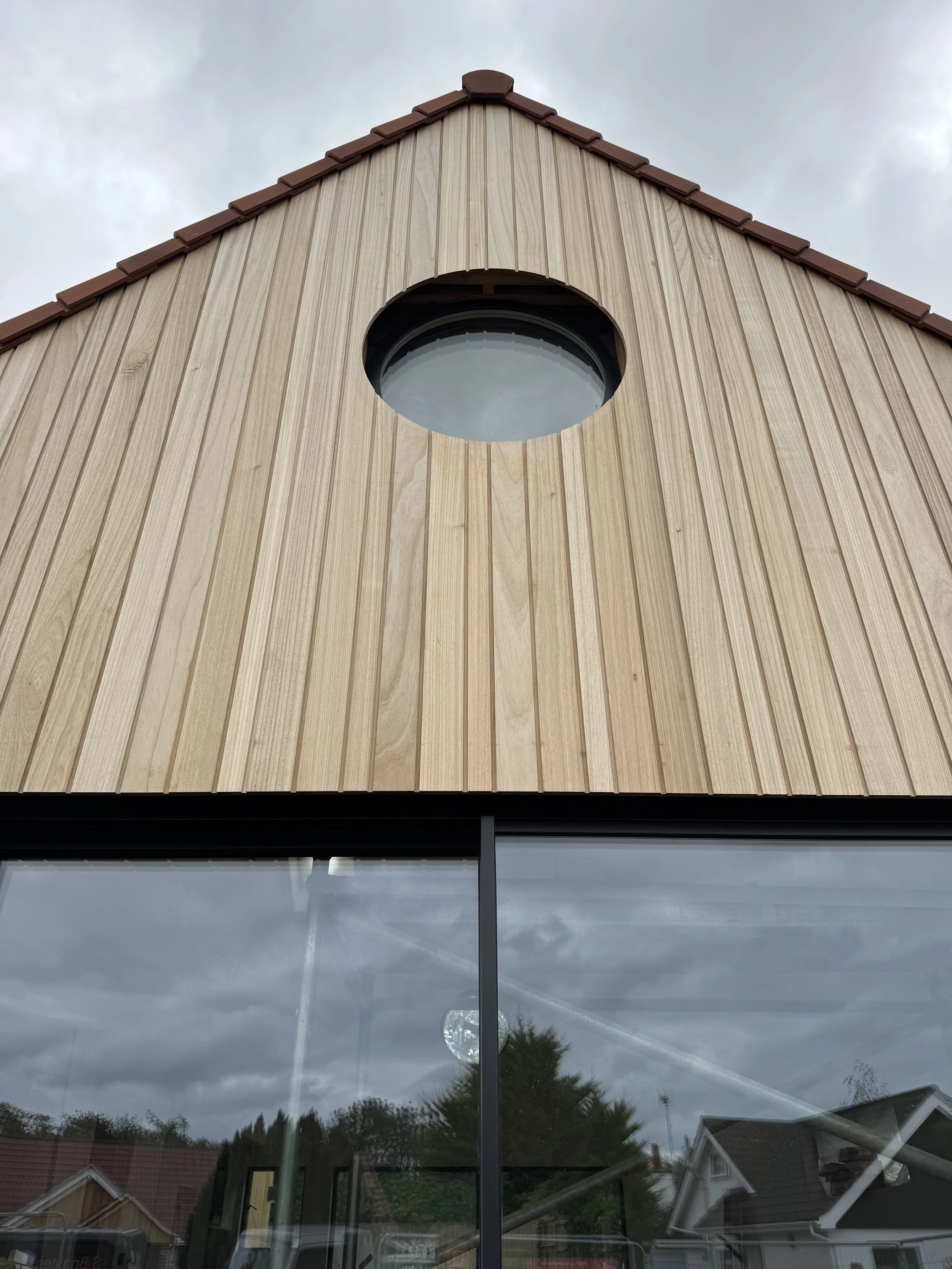 Vaulted ceilings, calming natural textures and a highly efficient design define this new build family house.
